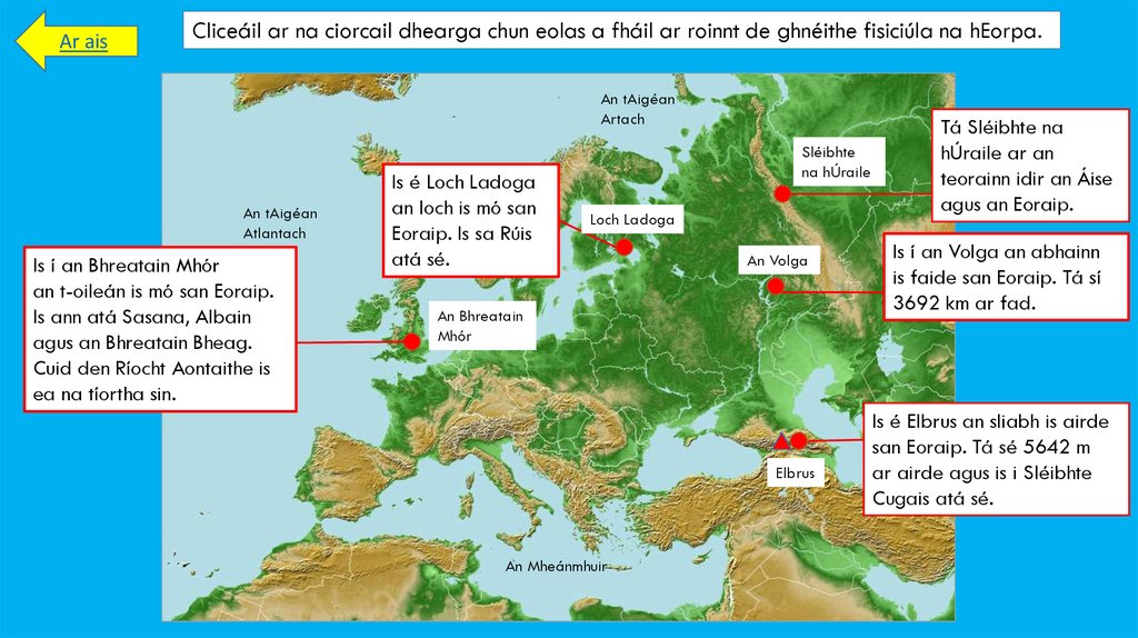 Ar aisCliceáil ar na ciorcail dhearga chun eolas a fháil ar roinnt de ghnéithe fisiciúla na hEorpa.