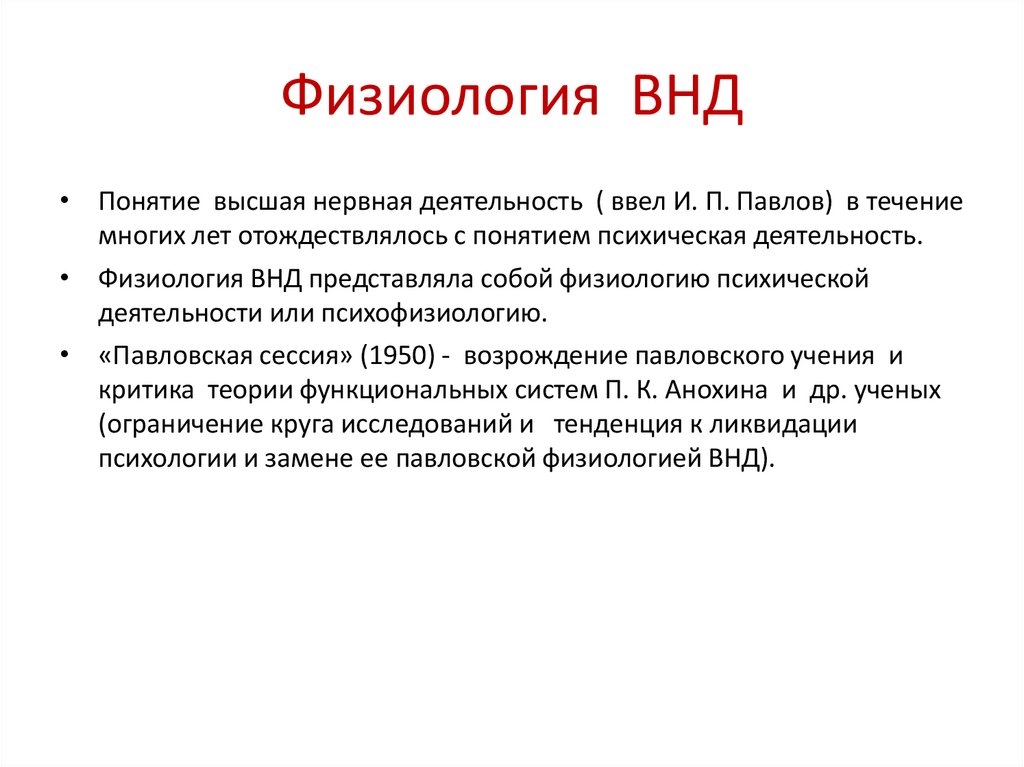 Физиология ВНД• Понятие высшая нервная деятельность ( ввел И. П. Павлов) в течение