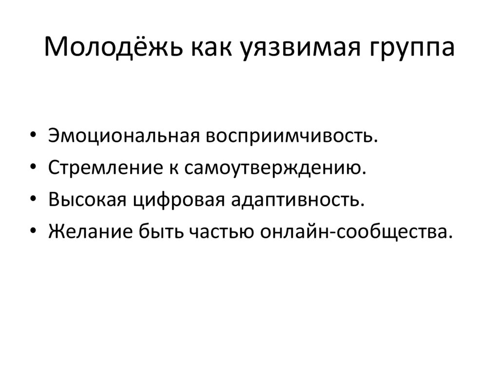 Молодёжь как уязвимая группа• Эмоциональная восприимчивость.