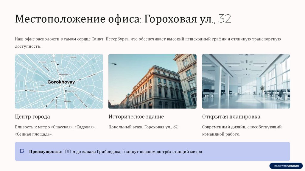 Местоположение офиса: Гороховая ул., 32Наш офис расположен в самом сердце Санкт-Петербурга, что обеспечивает высокий пешеходный трафик и отличную транспортную