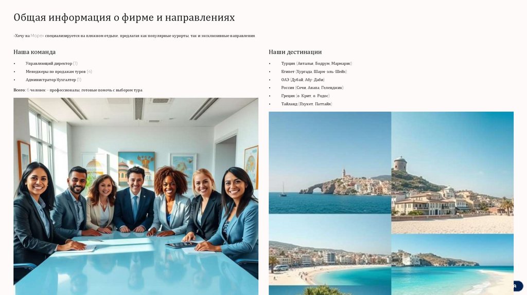 Общая информация о фирме и направлениях«Хочу на Mope» специализируется на пляжном отдыхе, предлагая как популярные курорты, так и эксклюзивные направления.