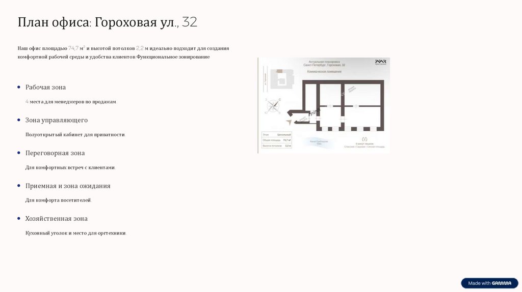 План офиса: Гороховая ул., 32Наш офис площадью 74,7 м² и высотой потолков 2,2 м идеально подходит для создания
