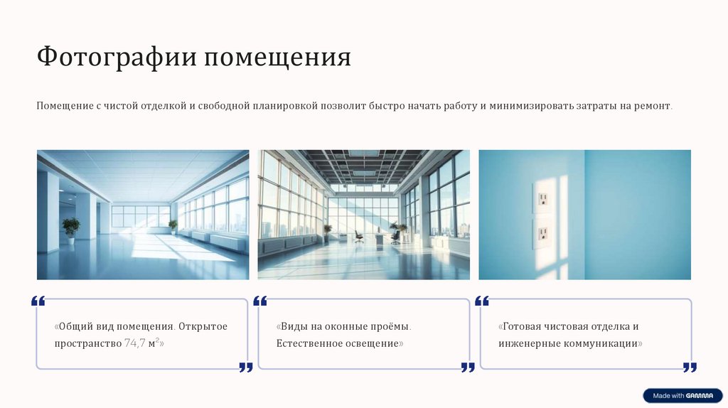 Фотографии помещенияПомещение с чистой отделкой и свободной планировкой позволит быстро начать работу и минимизировать затраты на ремонт.
