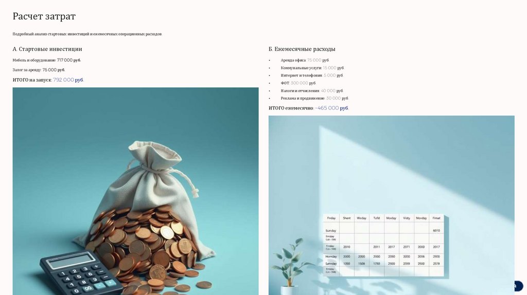 Расчет затратПодробный анализ стартовых инвестиций и ежемесячных операционных расходов.