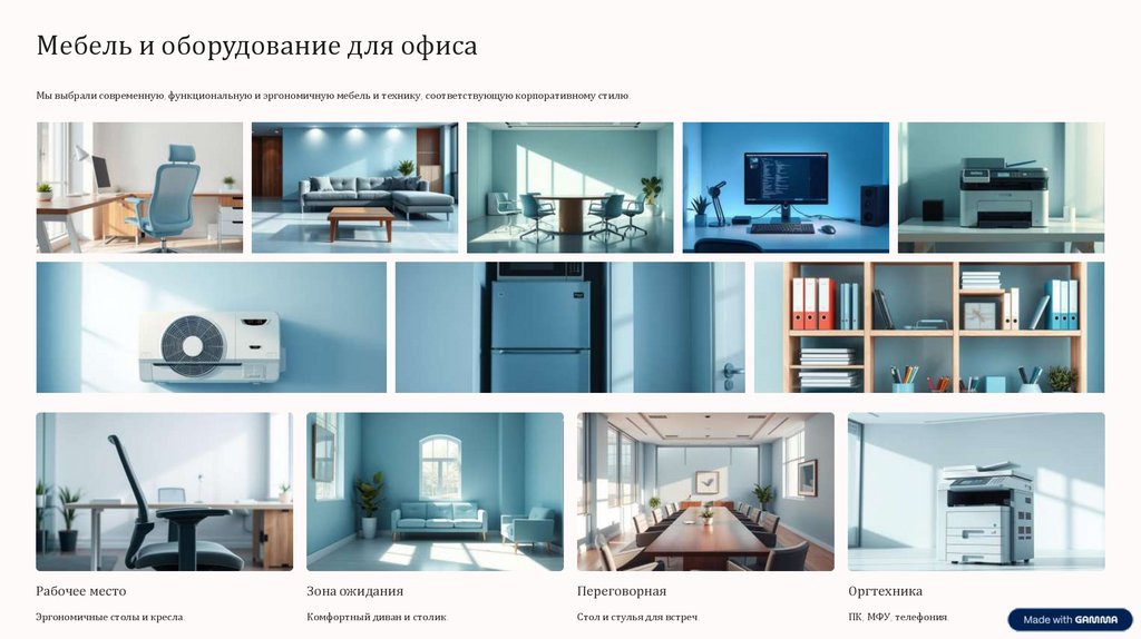 Мебель и оборудование для офисаМы выбрали современную, функциональную и эргономичную мебель и технику, соответствующую корпоративному стилю.