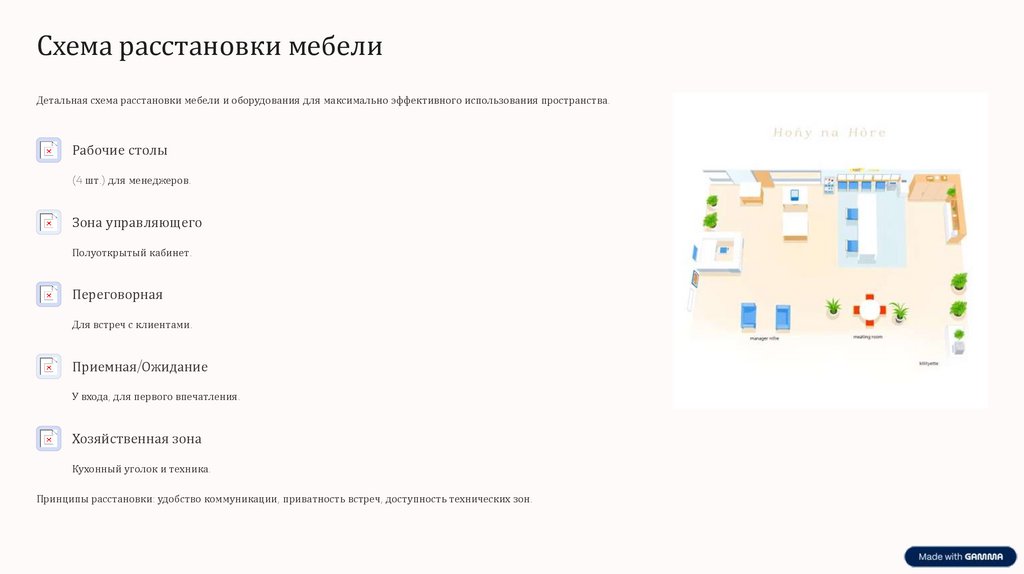 Схема расстановки мебелиДетальная схема расстановки мебели и оборудования для максимально эффективного использования пространства.
