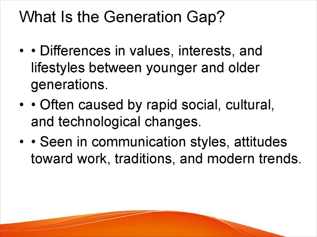 What Is the Generation Gap?• • Differences in values, interests, and