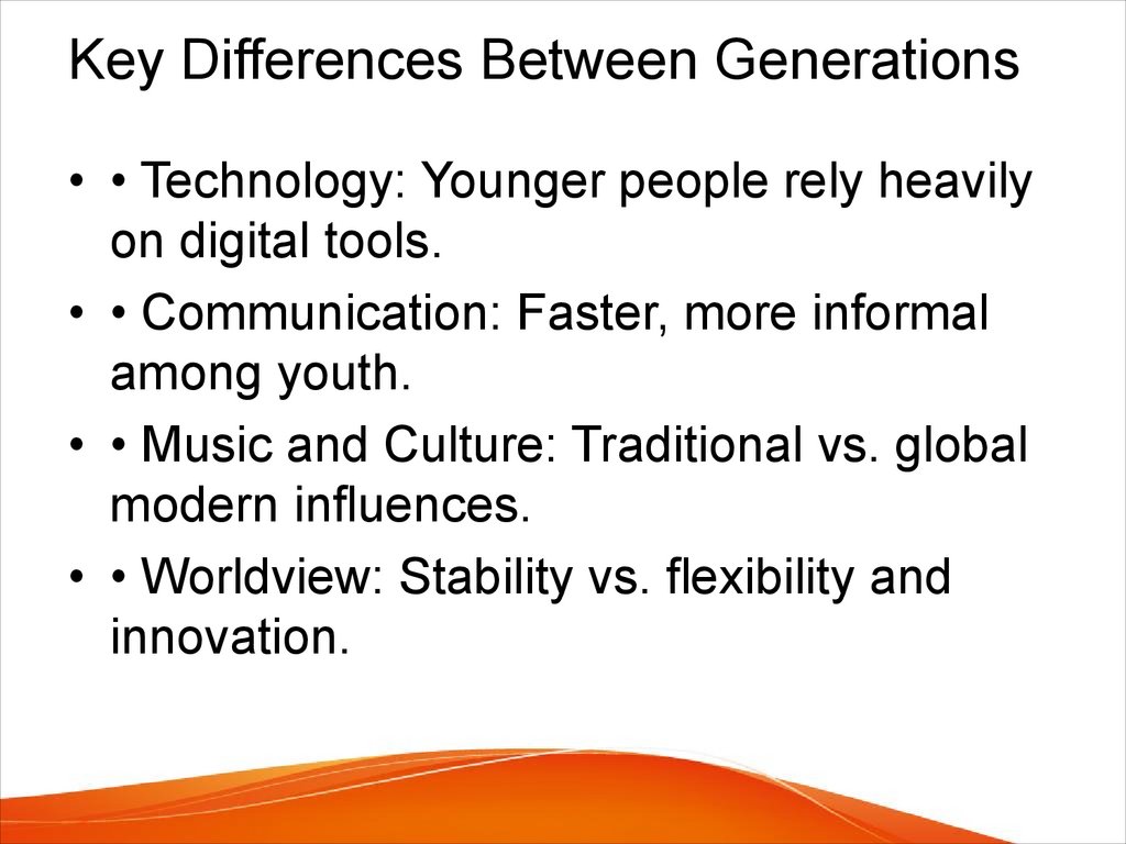 Key Differences Between Generations• • Technology: Younger people rely heavily