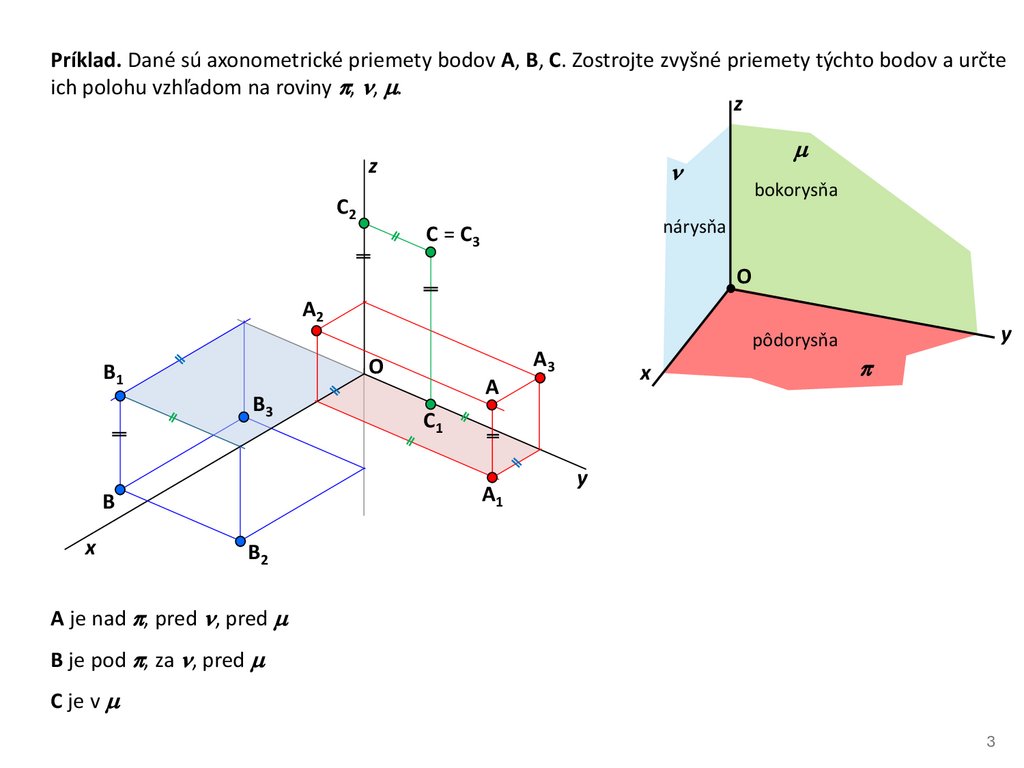 Príklad. Dané sú axonometrické priemety bodov A, B, C. Zostrojte zvyšné priemety týchto bodov a určteich polohu vzhľadom na roviny , , .