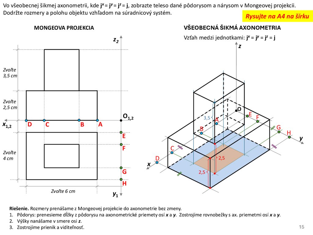 Riešenie. Rozmery prenášame z Mongeovej projekcie do axonometrie bez zmeny.