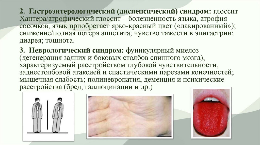 2. Гастроэнтерологический (диспепсический) синдром: глосситХантера/атрофический глоссит – болезненность языка, атрофия