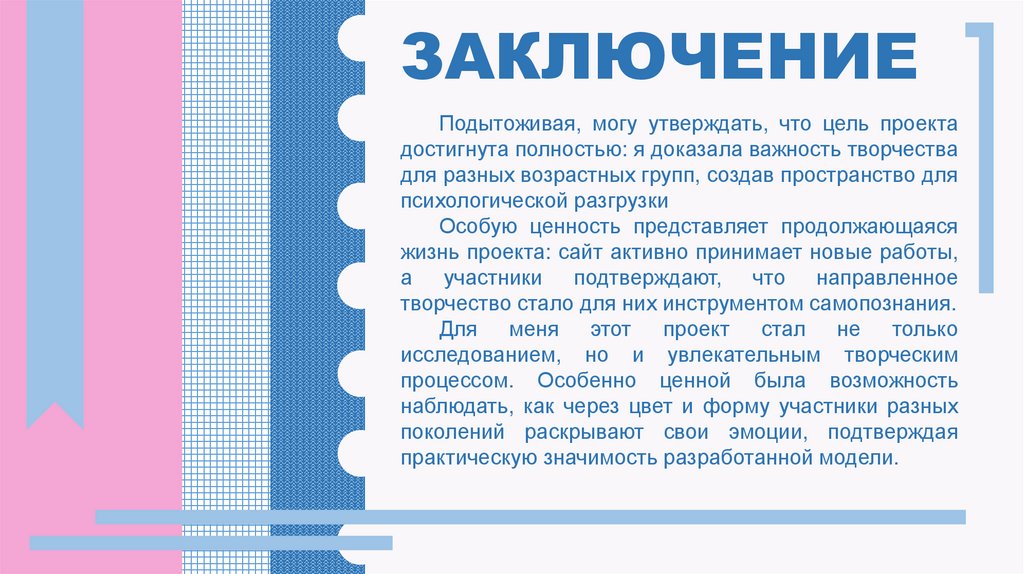 ЗАКЛЮЧЕНИЕПодытоживая, могу утверждать, что цель проекта