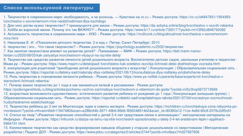 Список используемой литературы1. Творчество в современном мире: необходимость, а не роскошь. — Кристина на vc.ru – Режим доступа: https://vc.ru/id4847851/1954993tvorchestvo-v-sovremennom-mire-neobkhodimost-dlya-kazhdogo