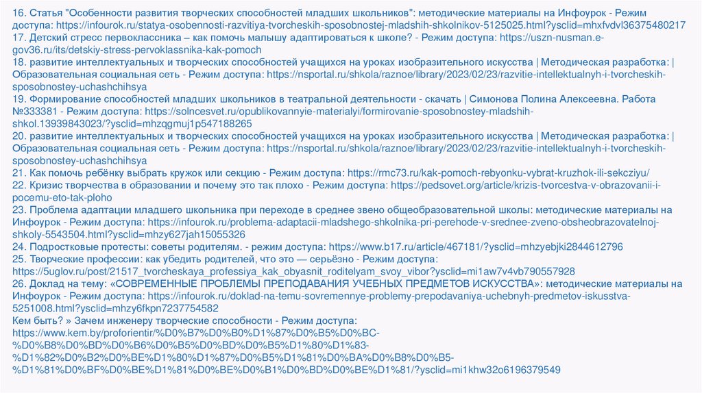 16. Статья "Особенности развития творческих способностей младших школьников": методические материалы на Инфоурок - Режимдоступа: https://infourok.ru/statya-osobennosti-razvitiya-tvorcheskih-sposobnostej-mladshih-shkolnikov-5125025.html?ysclid=mhxfvdvl36375480217
