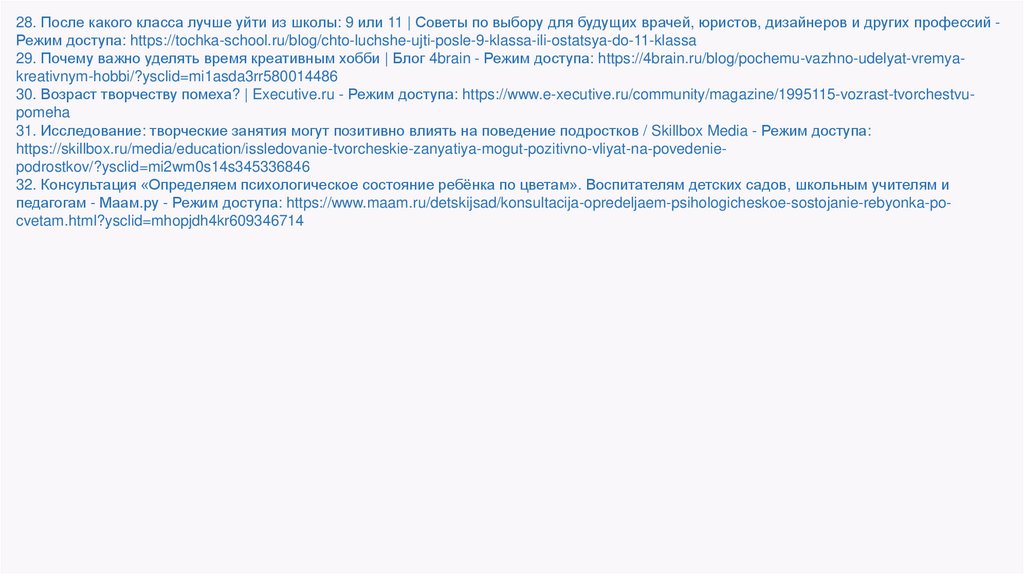 28. После какого класса лучше уйти из школы: 9 или 11 | Советы по выбору для будущих врачей, юристов, дизайнеров и других профессий Режим доступа: https://tochka-school.ru/blog/chto-luchshe-ujti-posle-9-klassa-ili-ostatsya-do-11-klassa29. Почему важно уделять время креативным хобби | Блог 4brain - Режим доступа: https://4brain.ru/blog/pochemu-vazhno-udelyat-vremyakreativnym-hobbi/?ysclid=mi1asda3rr580014486