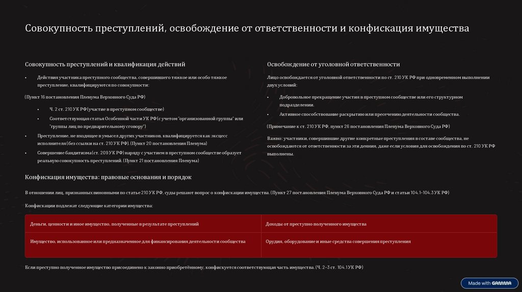 В отношении лиц, признанных виновными по статье 210 УК РФ, суды решают вопрос о конфискации имущества. (Пункт 27 постановления Пленума Верховного Суда РФ и статьи 104.1–104.3 УК РФ)