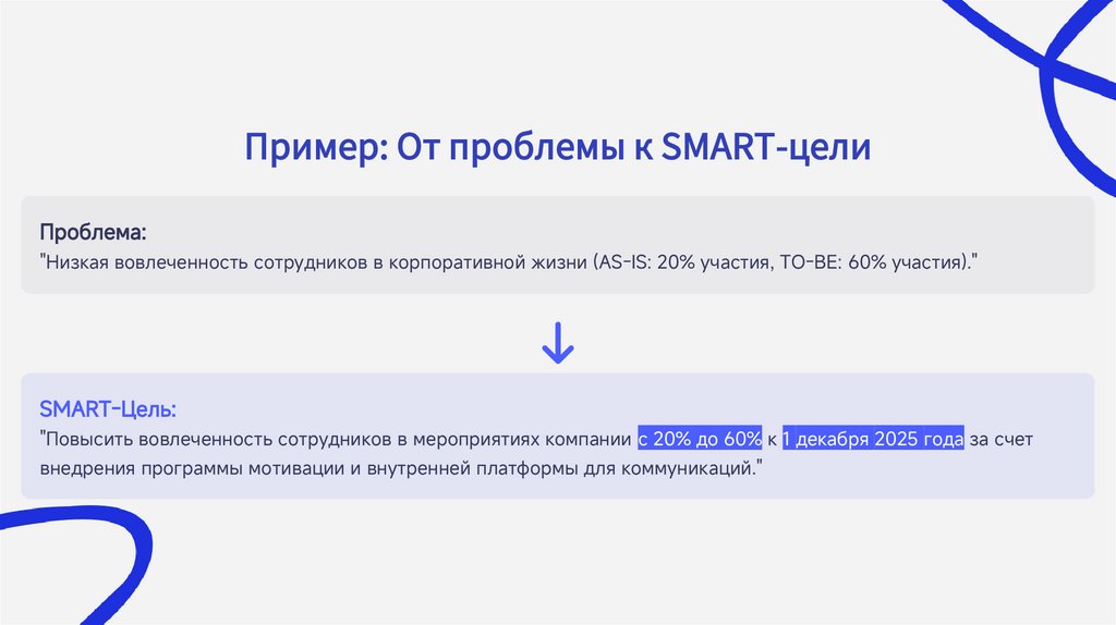 "Повысить вовлеченность сотрудников в мероприятиях компании с 20% до 60% к 1 декабря 2025 года за счет