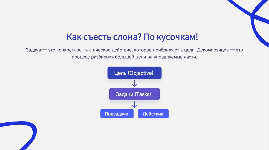 Как съесть слона? По кусочкам!Задача — это конкретное, тактическое действие, которое приближает к цели. Декомпозиция — это