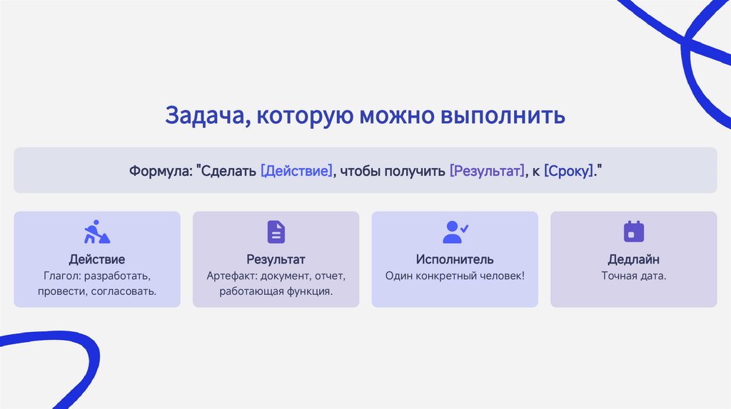 Задача, которую можно выполнитьФормула: "Сделать [Действие], чтобы получить [Результат], к [Сроку]."