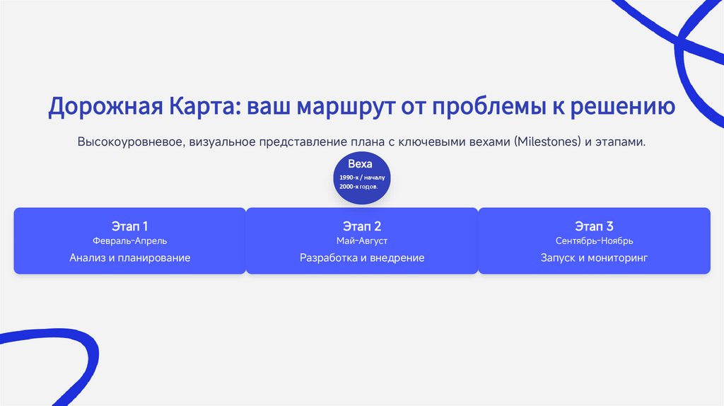 Дорожная Карта: ваш маршрут от проблемы к решениюВысокоуровневое, визуальное представление плана с ключевыми вехами (Milestones) и этапами.