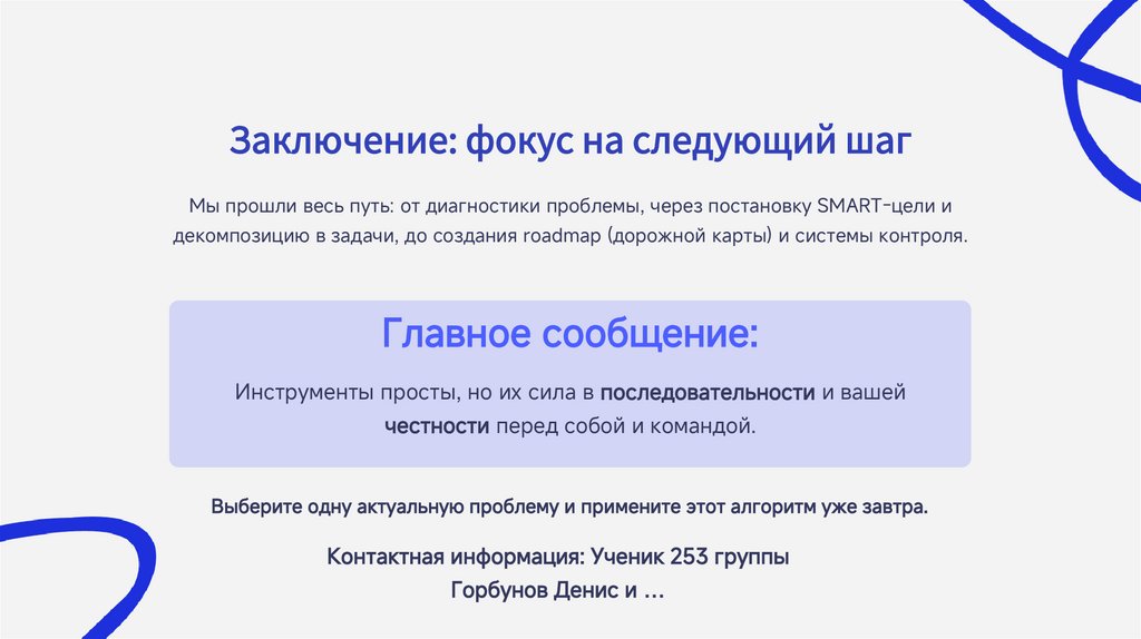Заключение: фокус на следующий шагМы прошли весь путь: от диагностики проблемы, через постановку SMART-цели и