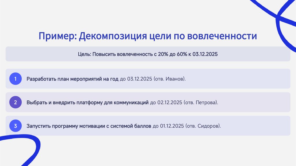 Пример: Декомпозиция цели по вовлеченностиЦель: Повысить вовлеченность с 20% до 60% к 03.12.2025