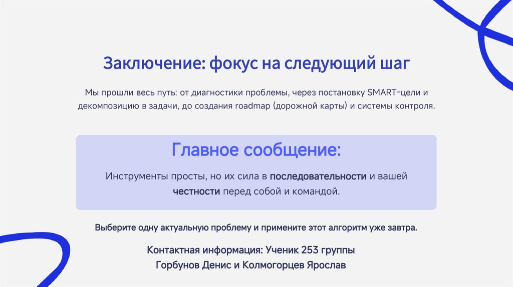 Заключение: фокус на следующий шагМы прошли весь путь: от диагностики проблемы, через постановку SMART-цели и