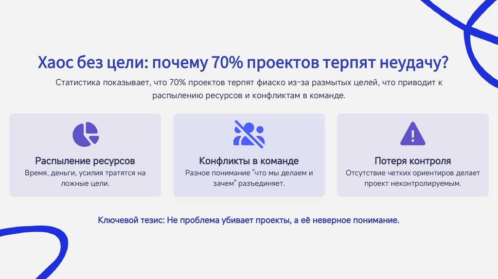 Хаос без цели: почему 70% проектов терпят неудачу?Статистика показывает, что 70% проектов терпят фиаско из-за размытых целей, что приводит к