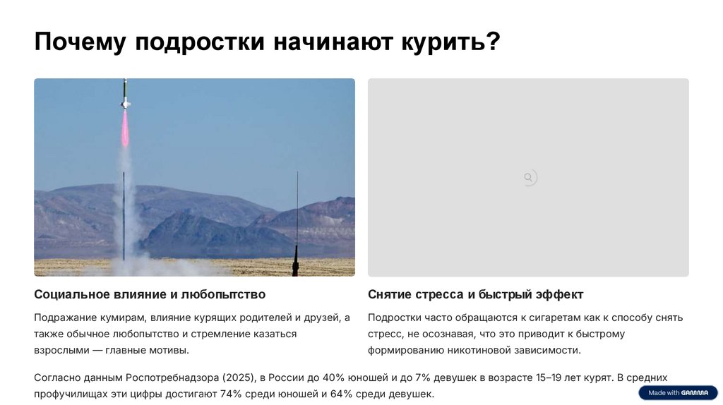 Согласно данным Роспотребнадзора (2025), в России до 40% юношей и до 7% девушек в возрасте 15–19 лет курят. В средних