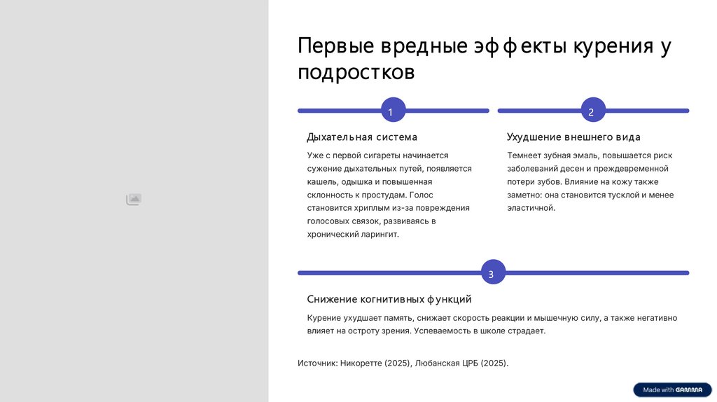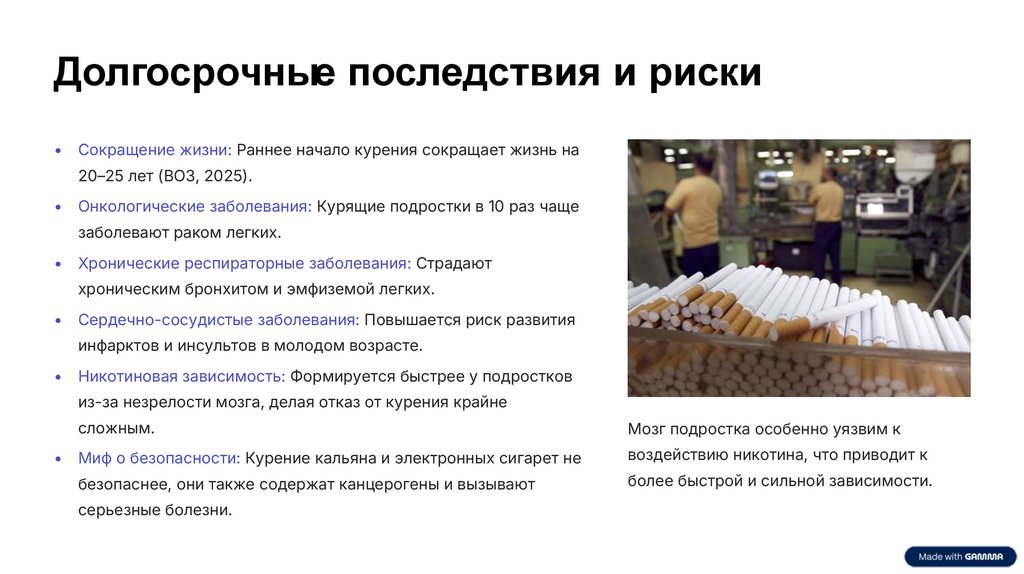 Долгосрочные последствия и риски• Сокращение жизни: Раннее начало курения сокращает жизнь на