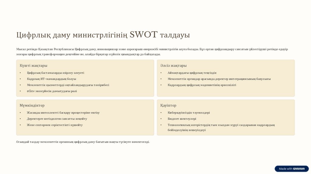 Цифрлық даму министрлігінің SWOT талдауыМысал ретінде Қазақстан Республикасы Цифрлық даму, инновациялар және аэроғарыш өнеркәсібі министрлігін алуға болады. Бұл орган цифрландыру саясатын үйлестіруші ретінде едәуір