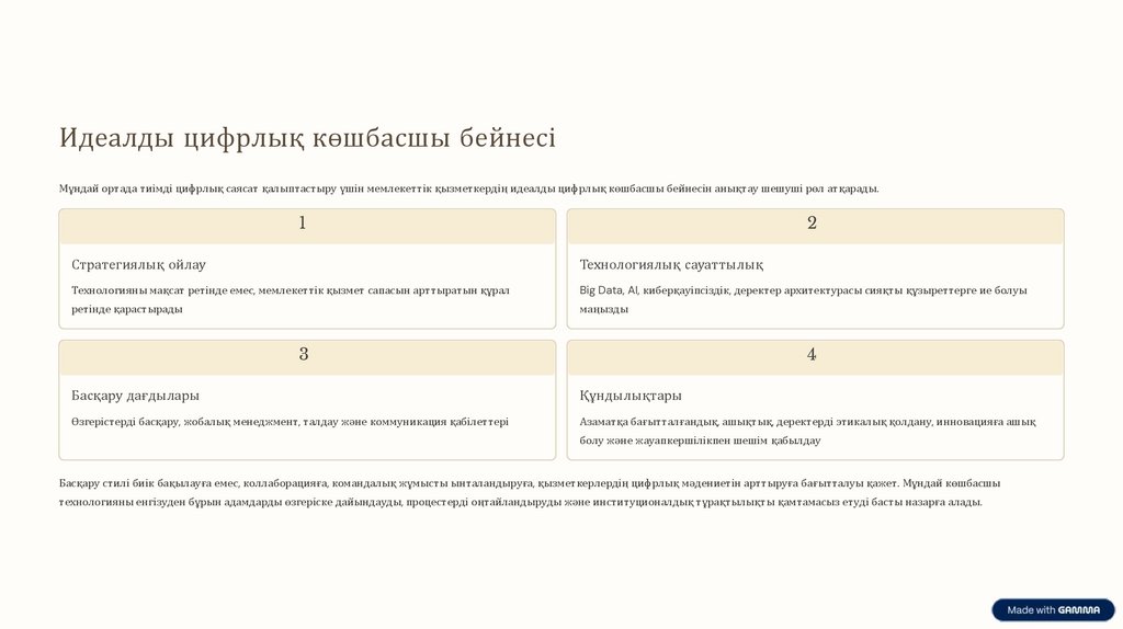 Идеалды цифрлық көшбасшы бейнесіМұндай ортада тиімді цифрлық саясат қалыптастыру үшін мемлекеттік қызметкердің идеалды цифрлық көшбасшы бейнесін анықтау шешуші рөл атқарады.