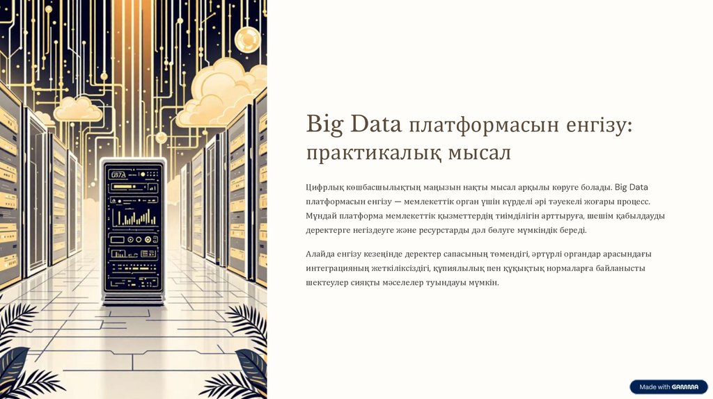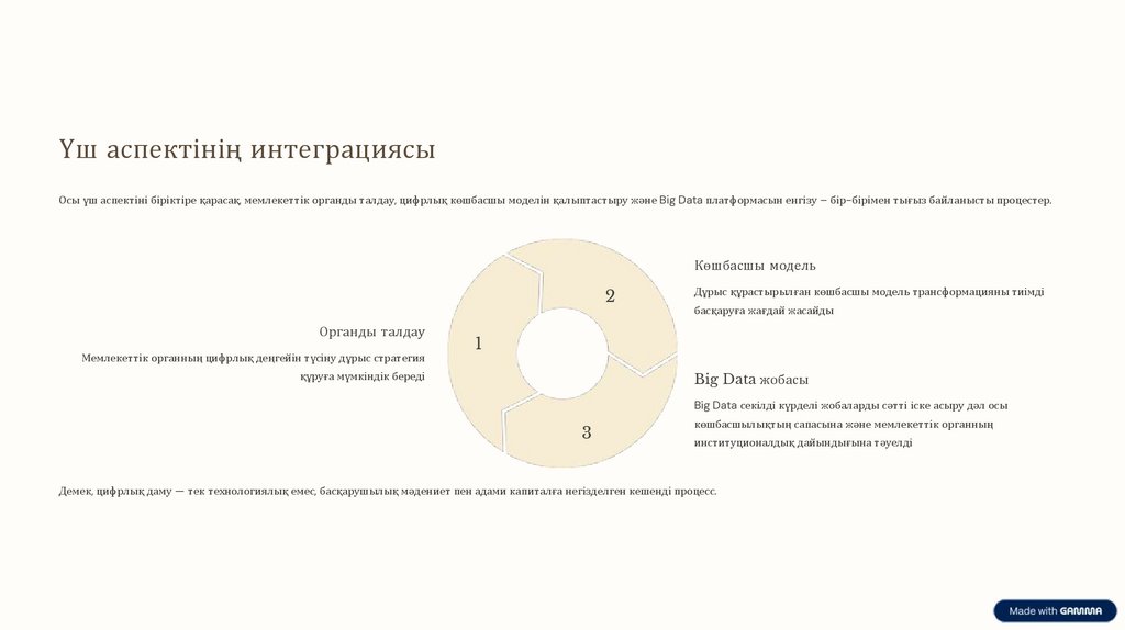 Үш аспектінің интеграциясыОсы үш аспектіні біріктіре қарасақ, мемлекеттік органды талдау, цифрлық көшбасшы моделін қалыптастыру және Big Data платформасын енгізу – бір-бірімен тығыз байланысты процестер.