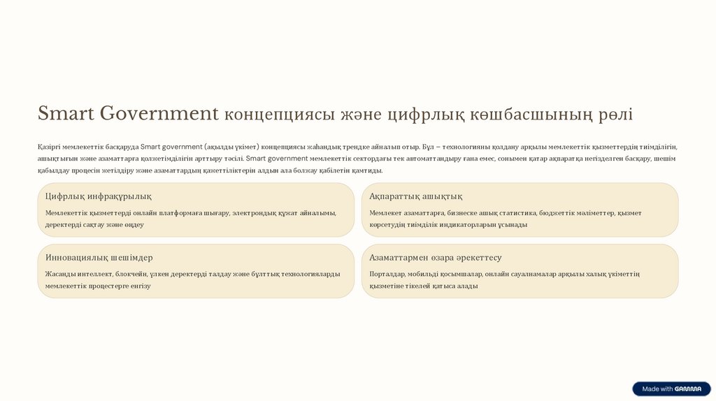 ашықтығын және азаматтарға қолжетімділігін арттыру тәсілі. Smart government мемлекеттік сектордағы тек автоматтандыру ғана емес, сонымен қатар ақпаратқа негізделген басқару, шешім