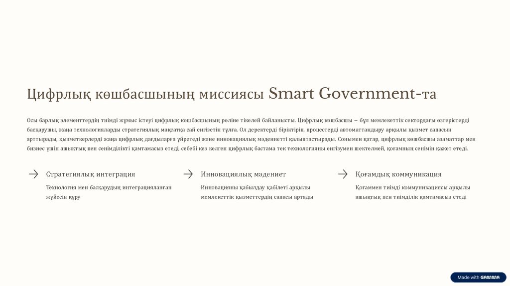 Цифрлық көшбасшының миссиясы Smart Government-таОсы барлық элементтердің тиімді жұмыс істеуі цифрлық көшбасшының рөліне тікелей байланысты. Цифрлық көшбасшы – бұл мемлекеттік сектордағы өзгерістерді