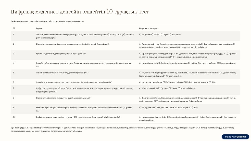 Цифрлық мәдениет деңгейін өлшейтін 10 сұрақтық тестЦифрлық мәдениет деңгейін анықтау үшін студенттерге арналған сұрақтар:
