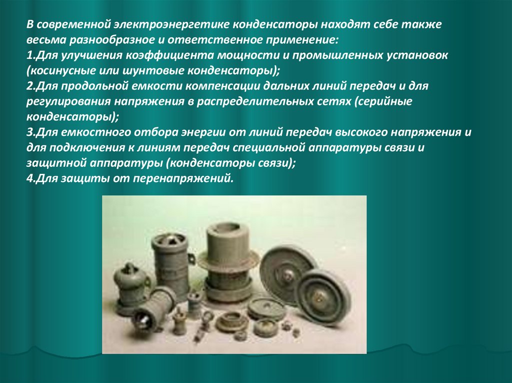 В современной электроэнергетике конденсаторы находят себе такжевесьма разнообразное и ответственное применение: