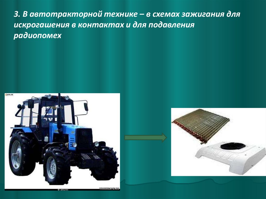 3. В автотракторной технике – в схемах зажигания дляискрогашения в контактах и для подавления