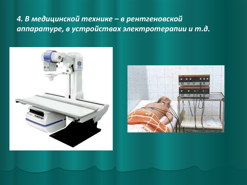 4. В медицинской технике – в рентгеновскойаппаратуре, в устройствах электротерапии и т.д.