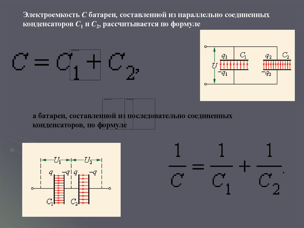 Электроемкость C батареи, составленной из параллельно соединенныхконденсаторов C1 и C2, рассчитывается по формуле