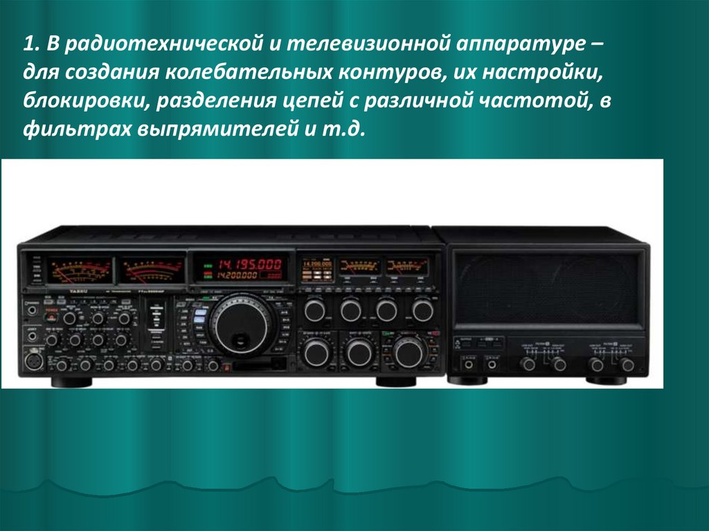 1. В радиотехнической и телевизионной аппаратуре –для создания колебательных контуров, их настройки,