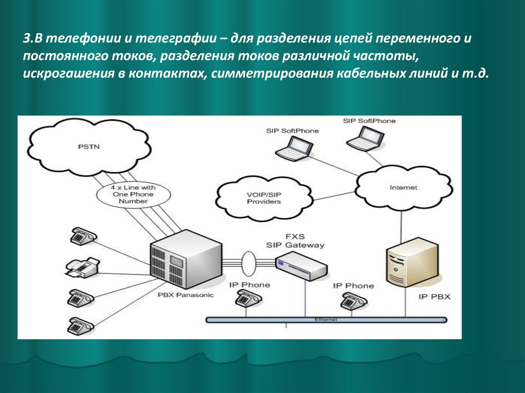 3.В телефонии и телеграфии – для разделения цепей переменного ипостоянного токов, разделения токов различной частоты,