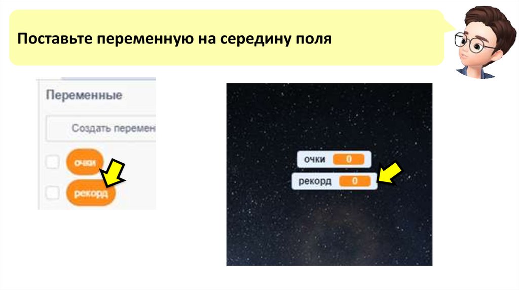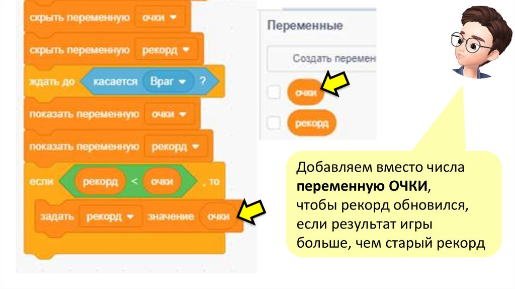 Добавляем вместо числапеременную ОЧКИ,
