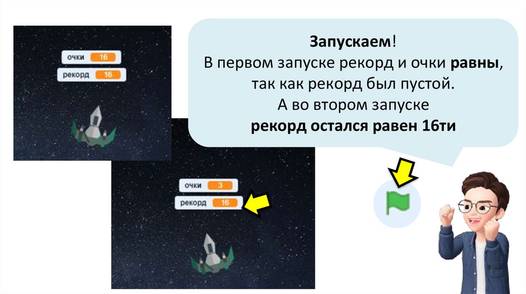Запускаем!В первом запуске рекорд и очки равны,