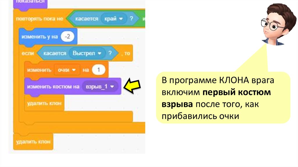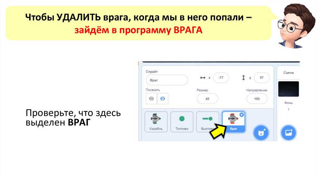 Чтобы УДАЛИТЬ врага, когда мы в него попали –зайдём в программу ВРАГА