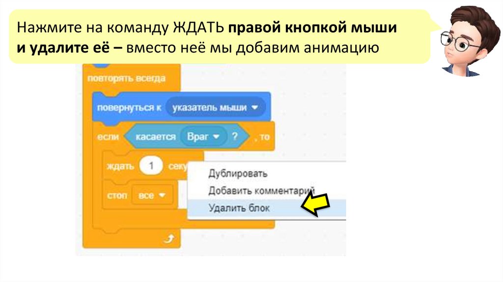 Нажмите на команду ЖДАТЬ правой кнопкой мышии удалите её – вместо неё мы добавим анимацию