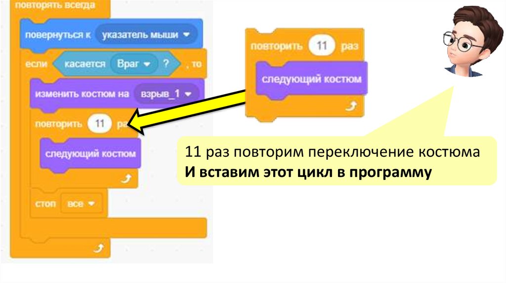 11 раз повторим переключение костюмаИ вставим этот цикл в программу