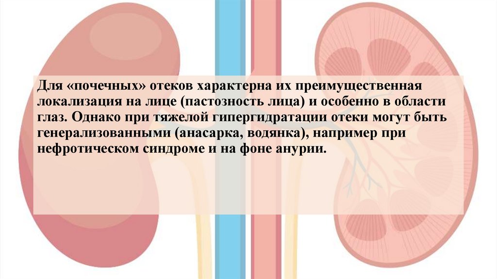 Для «почечных» отеков характерна их преимущественнаялокализация на лице (пастозность лица) и особенно в области