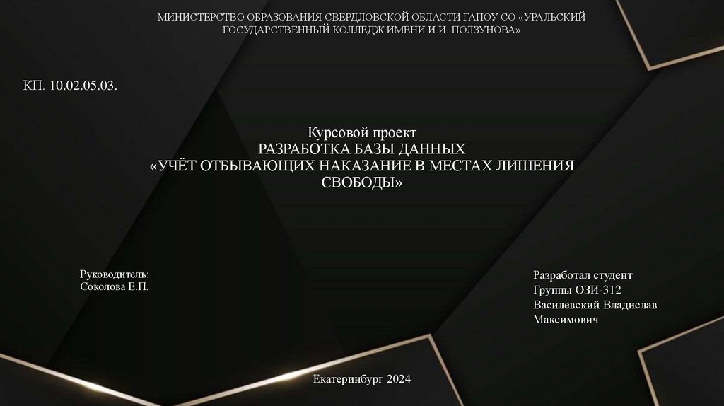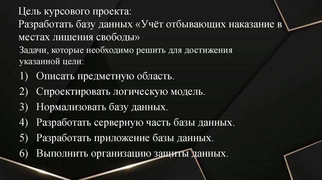 Цель курсового проекта:Разработать базу данных «Учёт отбывающих наказание в