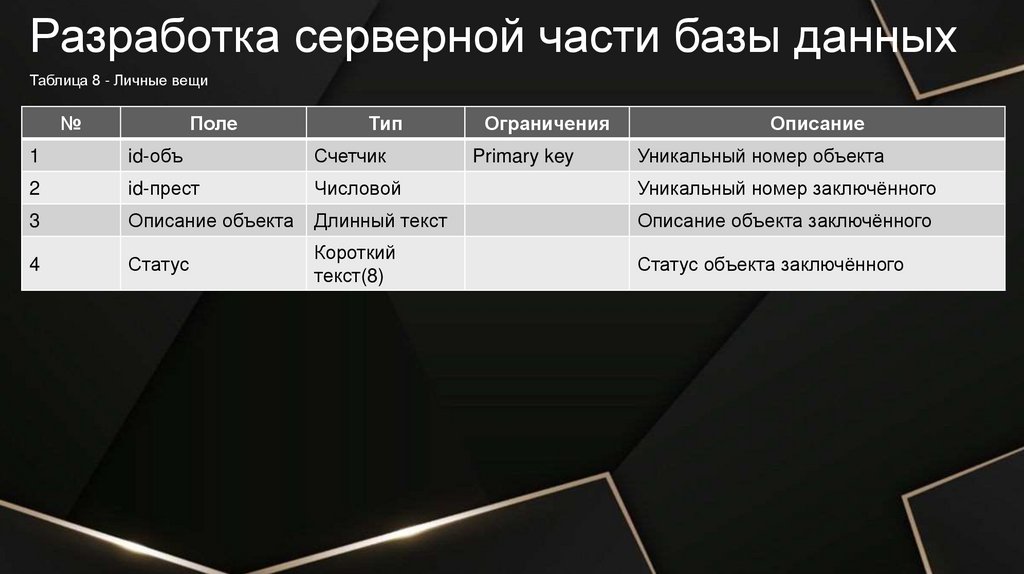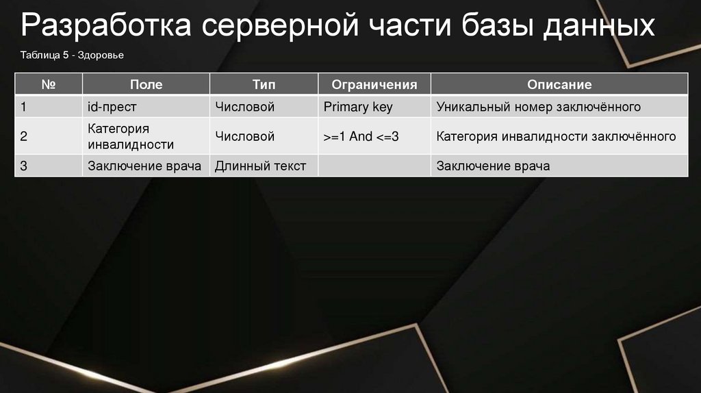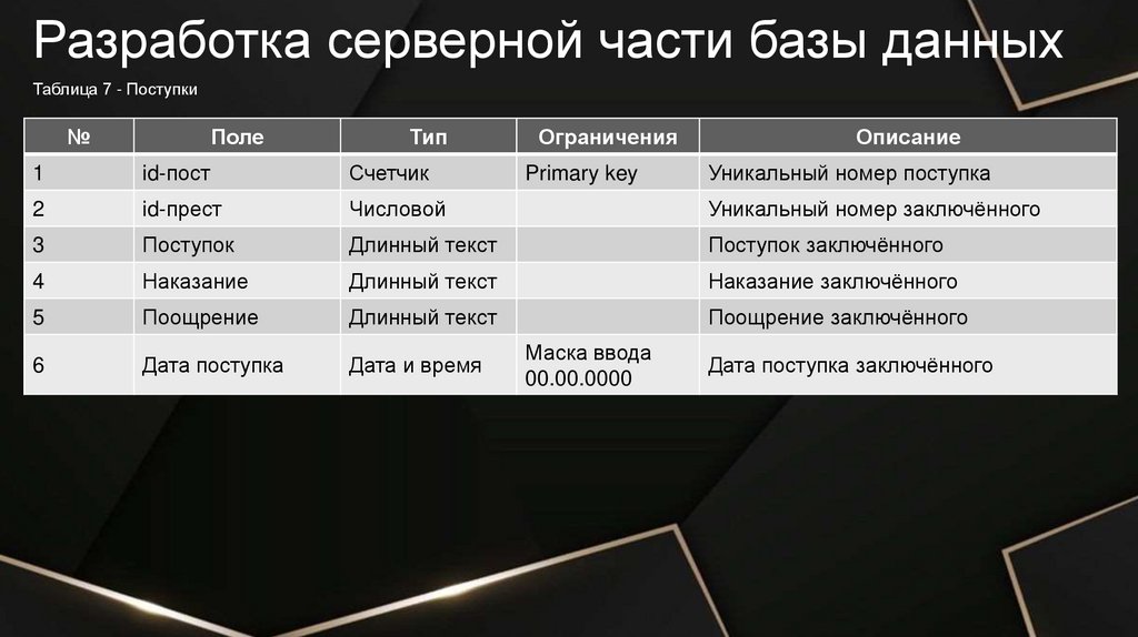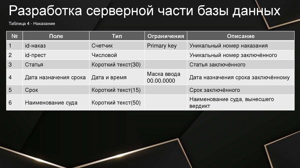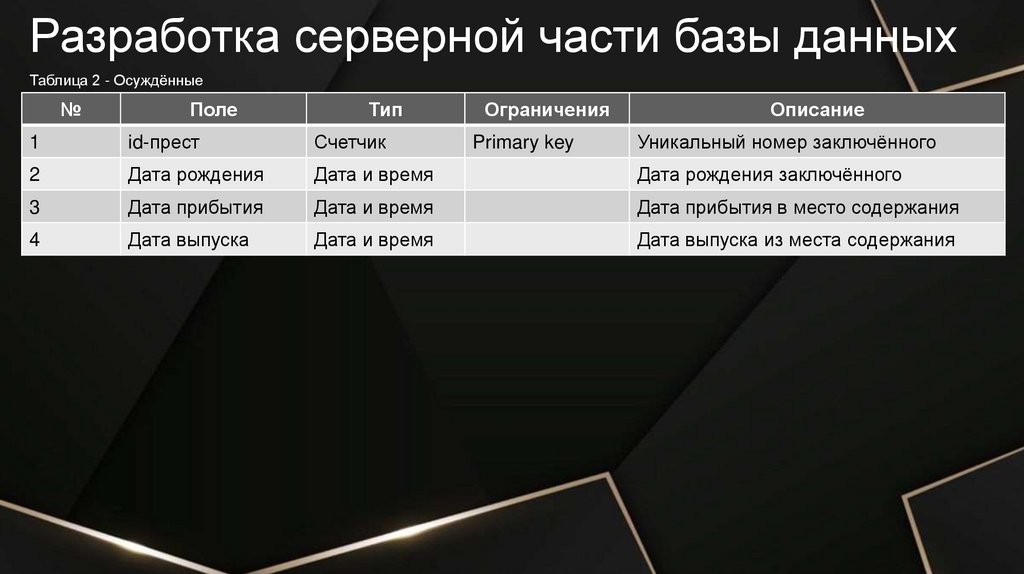 Разработка серверной части базы данныхТаблица 2 - Осуждённые